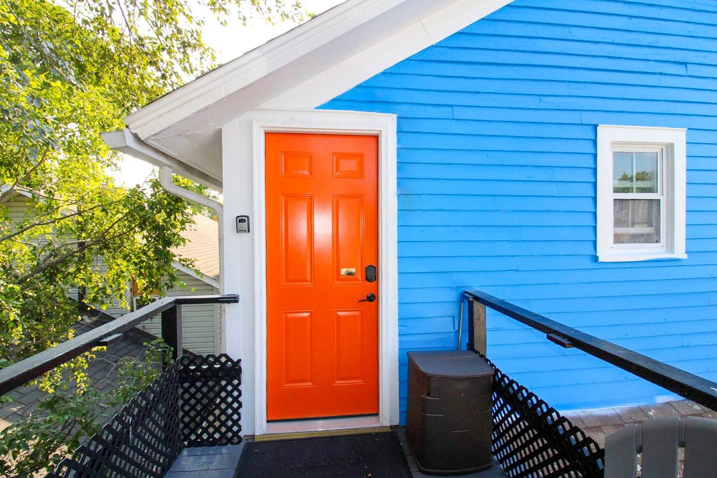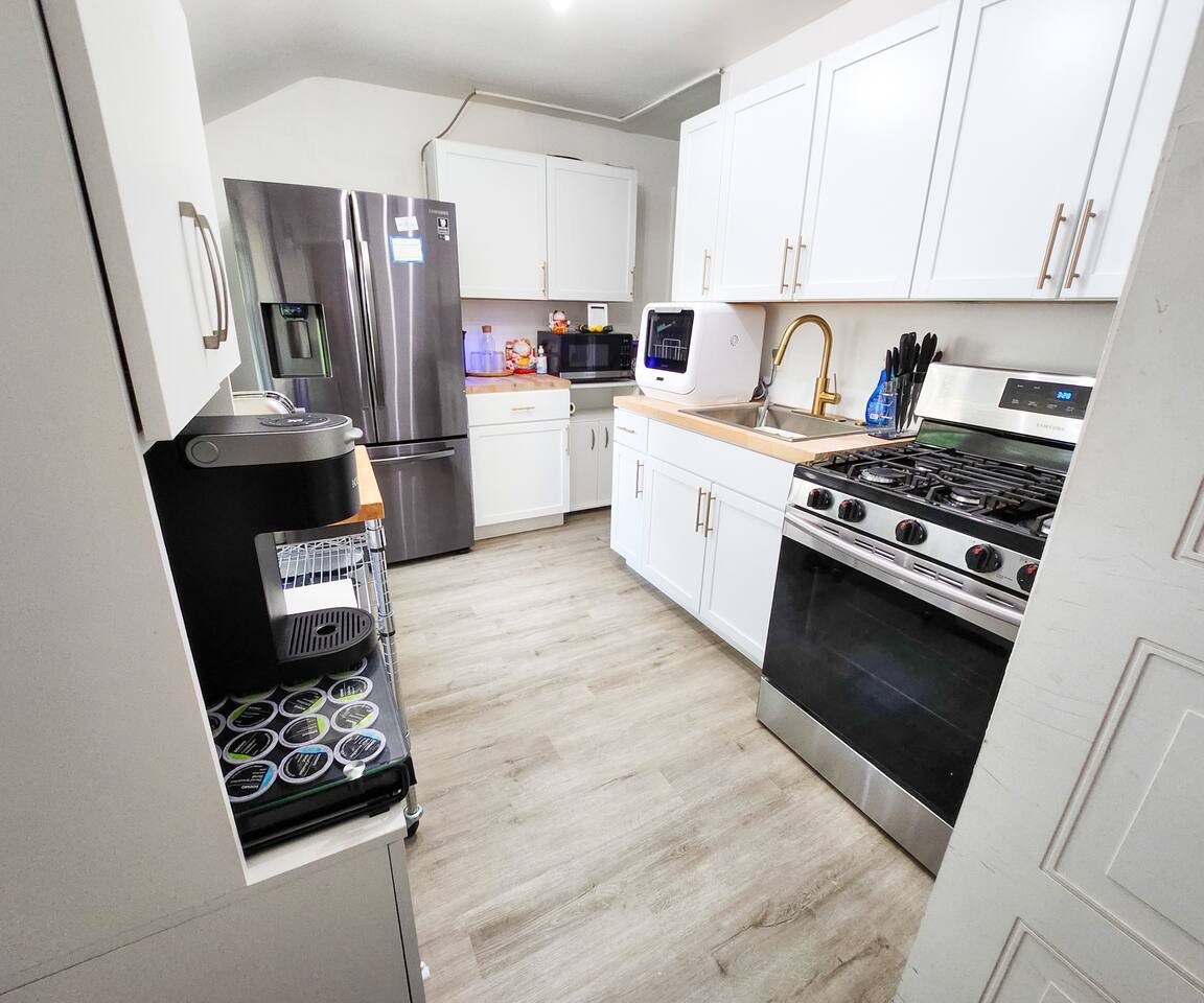 The entrance is on the upper deck/balcony. Enjoy effortless self check-in and check-out at our unit, equipped with cutting-edge SmartLock technology. Once your booking is confirmed, receive a unique, system-generated code, granting you secure and easy access throughout your stay. This convenient feature ensures a smooth, hassle-free experience from arrival to departure, perfect for guests seeking autonomy and ease in their travel accommodations. Up to two cars can park at the back, on the right side of the garage door. For additional vehicles, free parking is available in front of the house in our safe, peaceful neighborhood. Please leave the left side of the garage clear, as it's reserved for the downstairs unit.