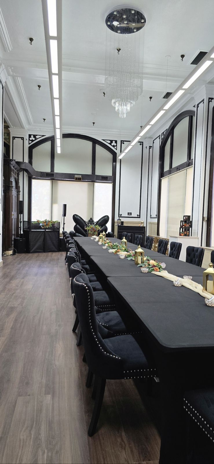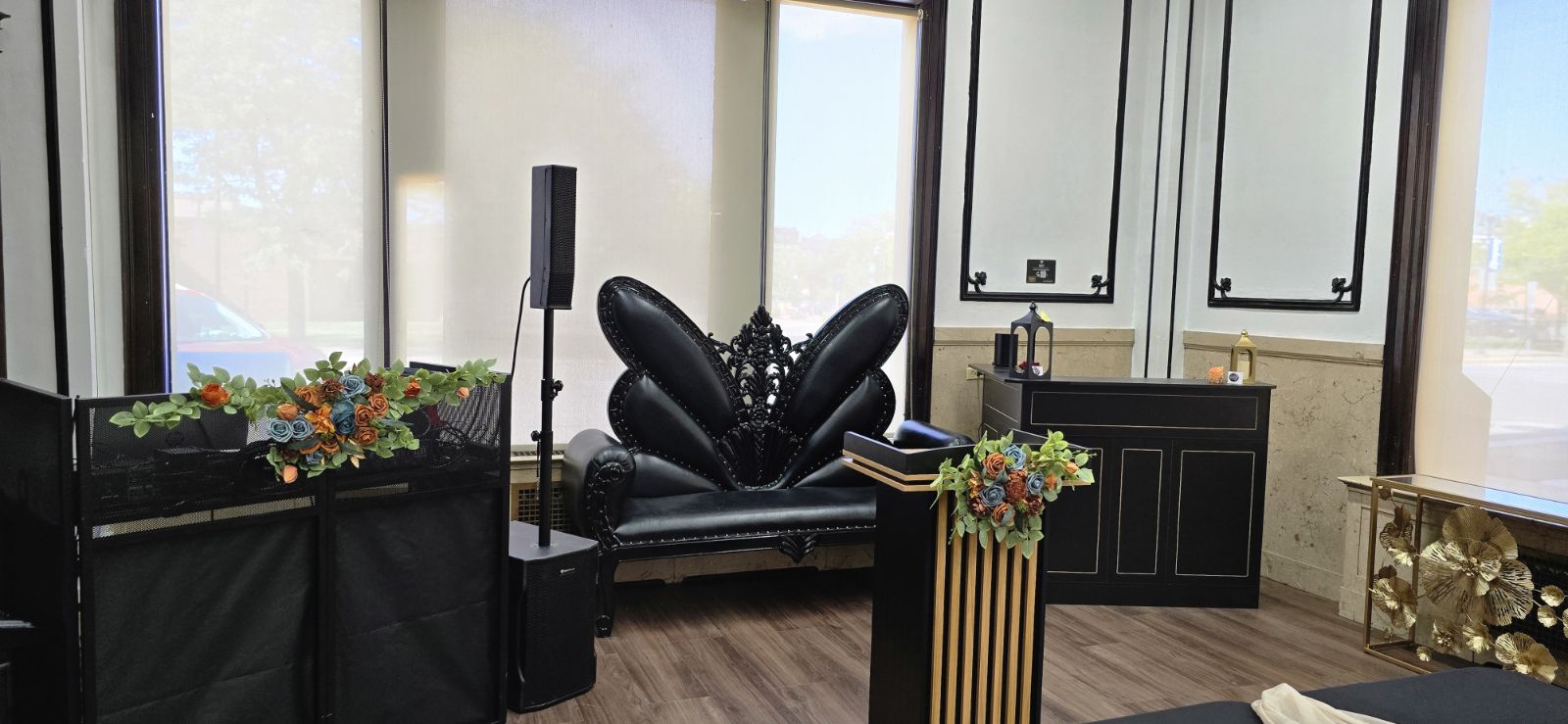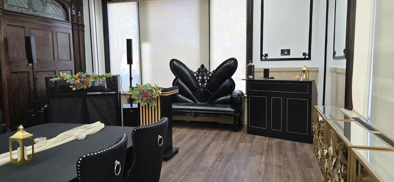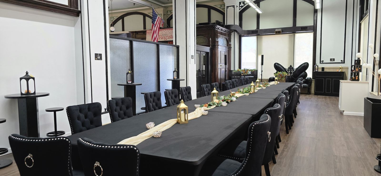 Downtown ballroom for events up to 50 guests. Elegant ballroom layout with long banquet table, statement loveseat, plush chairs; rich wood floors and tall windows. Entire unique shipping-container place; 1 bedroom, 1 bath, 1 bed; wifi, TV, AC, heating, EV charger, smoke/CO detector, extinguisher, first-aid. In downtown Sandusky near Jackson Street Pier, waterfront, Merry-Go-Round Museum; short 5–15 min walks, on-street and lot parking, limited transit and seasonal ferries. Best for micro-weddings, showers, corporate dinners.