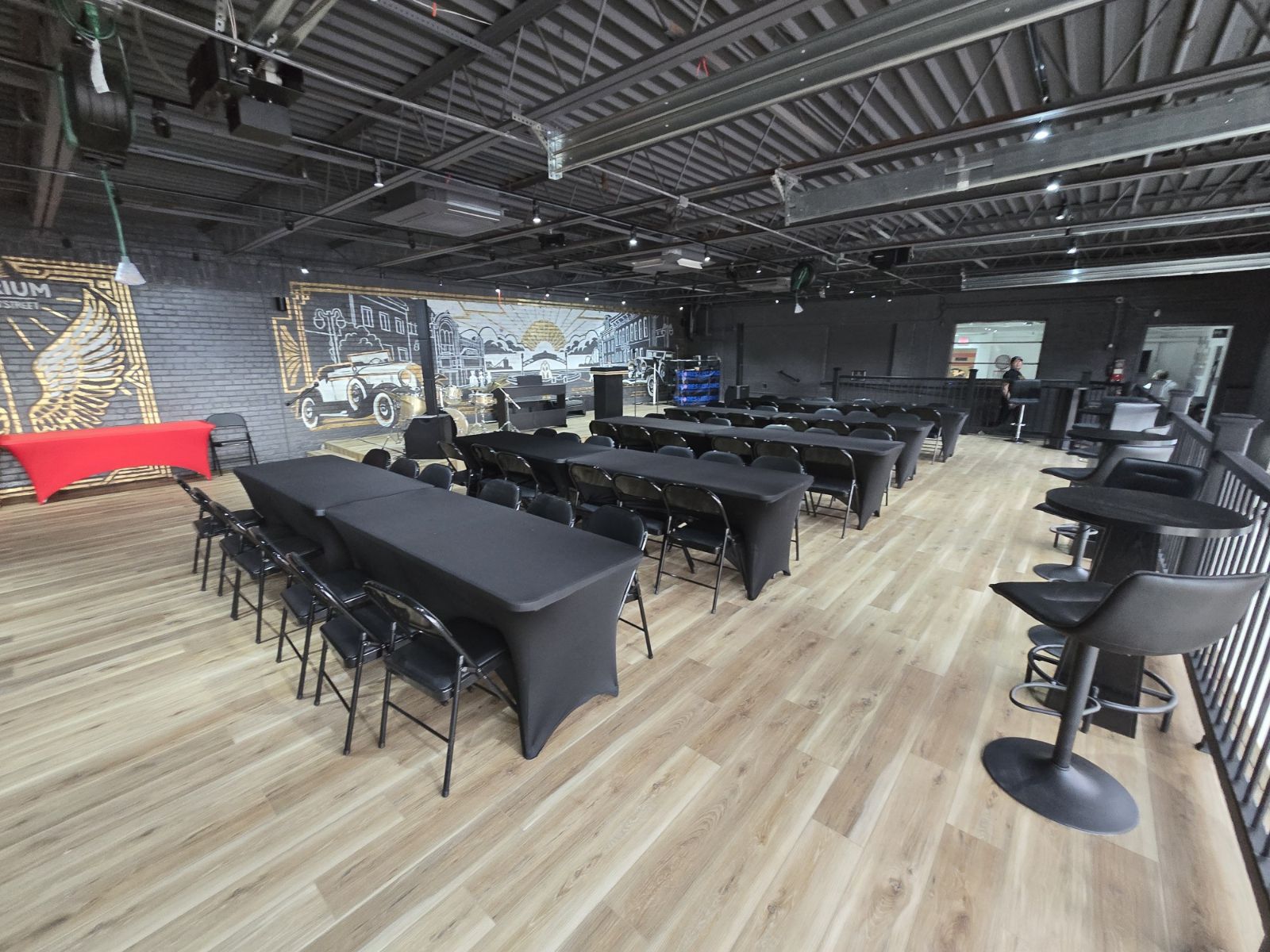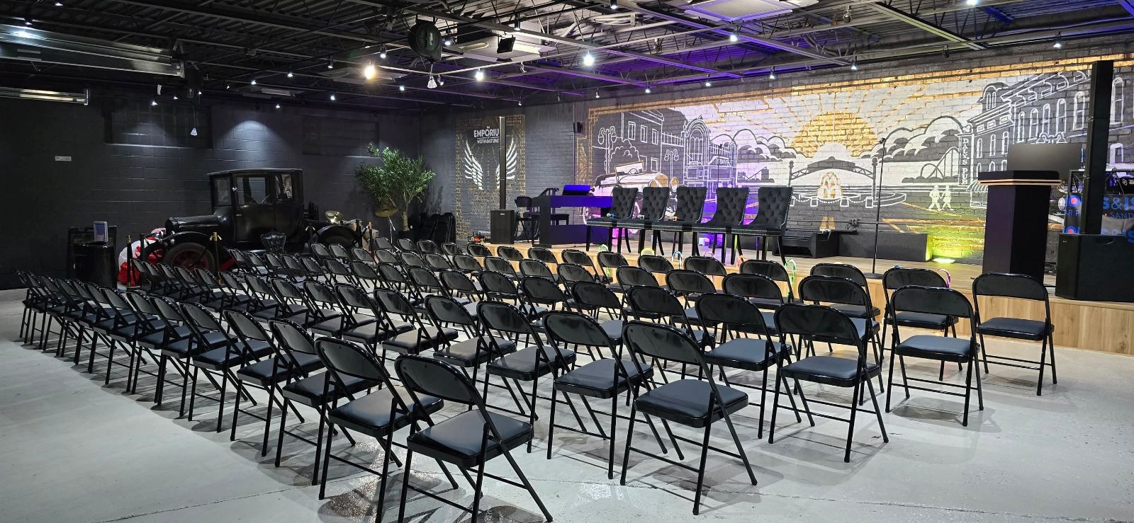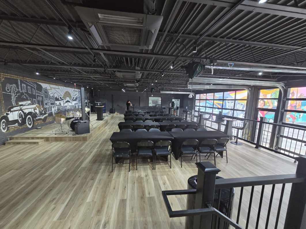 Versatile industrial event space for 100 guests without table and 50 with tables. Exposed ceilings, modern lighting, bold mural backdrop, built-in stage and open floor plan; flexible seating (up to 100 standing per host note). Includes wifi, TV, AC/heating, EV charger and paid on-site garage parking. Downtown Sandusky waterfront location within walking distance of restaurants, theaters, marinas and ferry services; transit and Amtrak access nearby. Ideal for concerts, pop-ups, meetings and private parties.