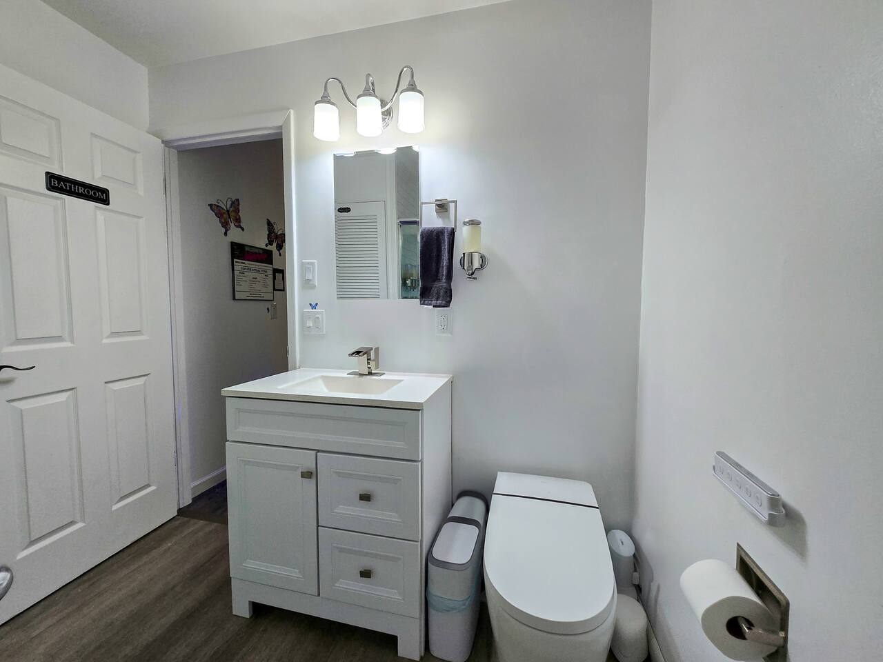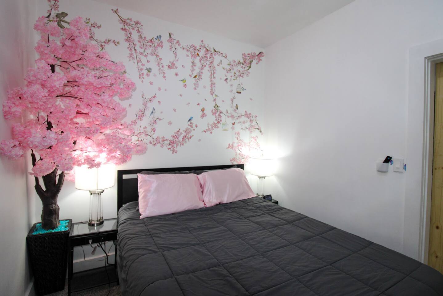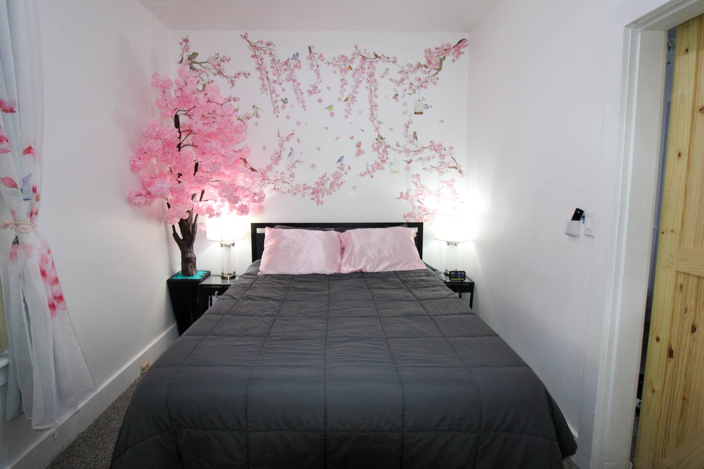 The entrance is on back next to the driveway and staircase. Enjoy effortless self check-in and check-out at our unit, equipped with cutting-edge SmartLock technology. Once your booking is confirmed, receive a unique, system-generated code, granting you secure and easy access throughout your stay. This convenient feature ensures a smooth, hassle-free experience from arrival to departure, perfect for guests seeking autonomy and ease in their travel accommodations. Up to two cars can park at the back, on the left side of the garage door. For additional vehicles, free parking is available in front of the house in our safe, peaceful neighborhood. Please leave the right side of the garage clear, as it's reserved for the downstairs unit.